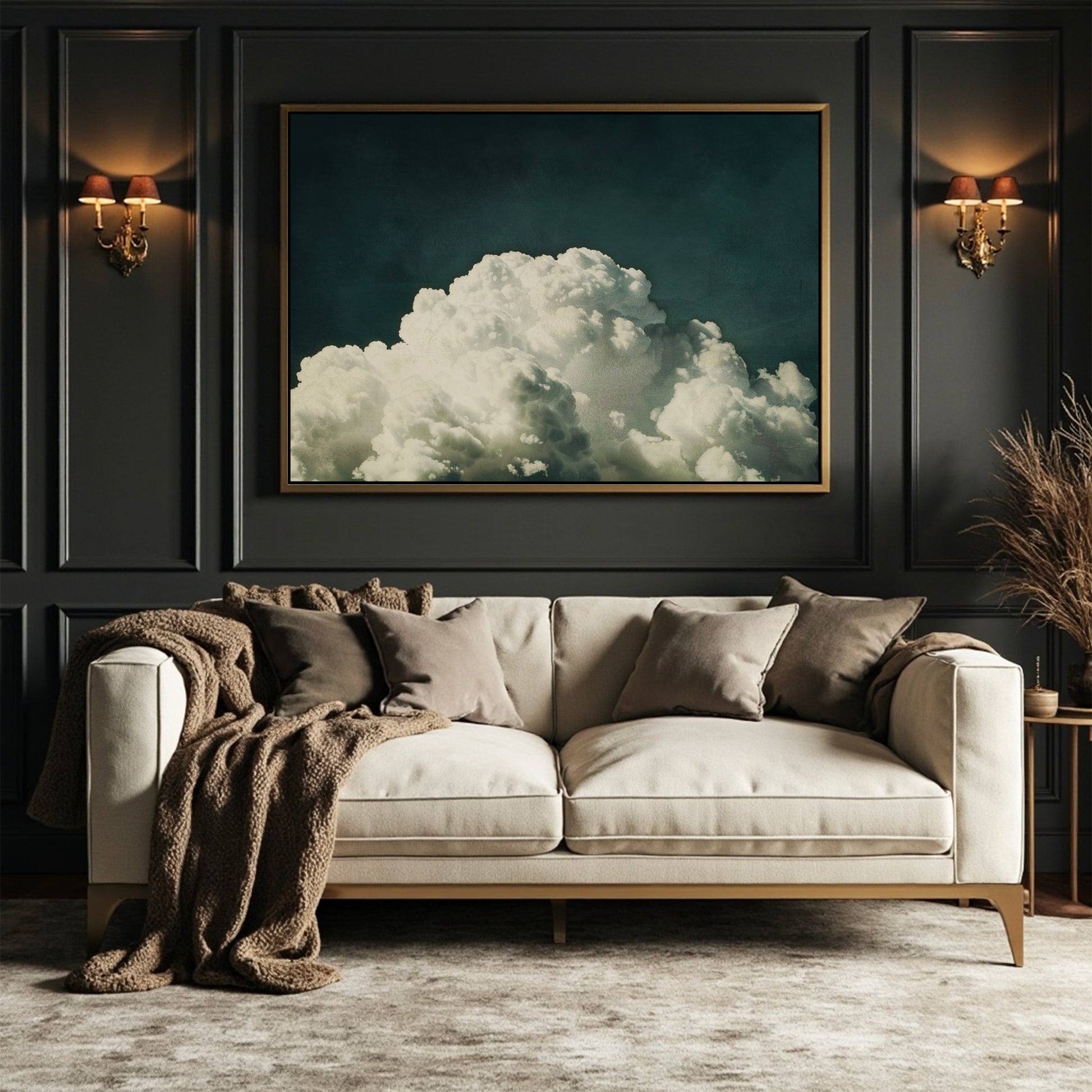 Add a sense of awe and tranquility to your walls with this majestic cloud wall art. A towering formation of luminous white clouds rises against a deep teal sky, creating a dramatic yet calming statement piece. This artwork blends realism and dreamlike mood, perfect for those who find beauty in stillness and skyward wonder.