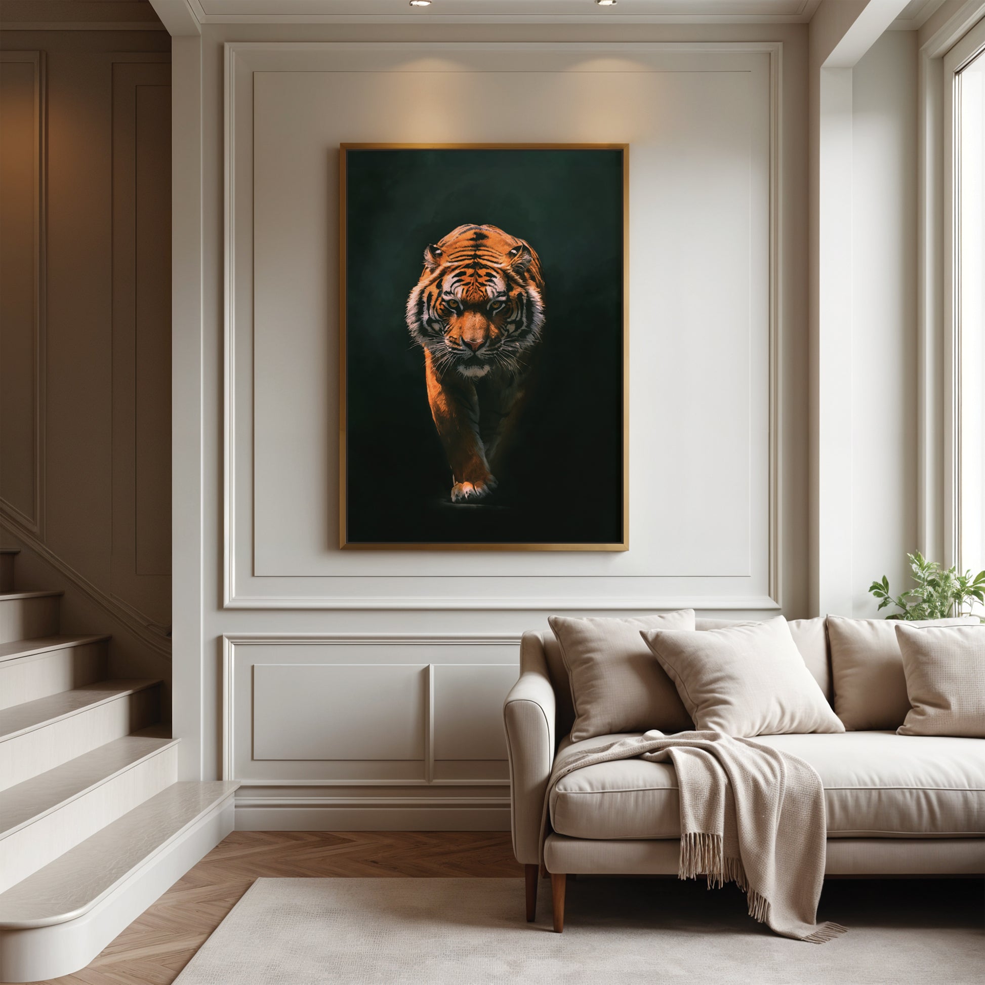 Make a statement with this striking print featuring a powerful tiger set against a rich emerald green background. The deep tones and detailed design create a sense of strength and elegance—perfect for adding a touch of the wild to any modern, contemporary living area.