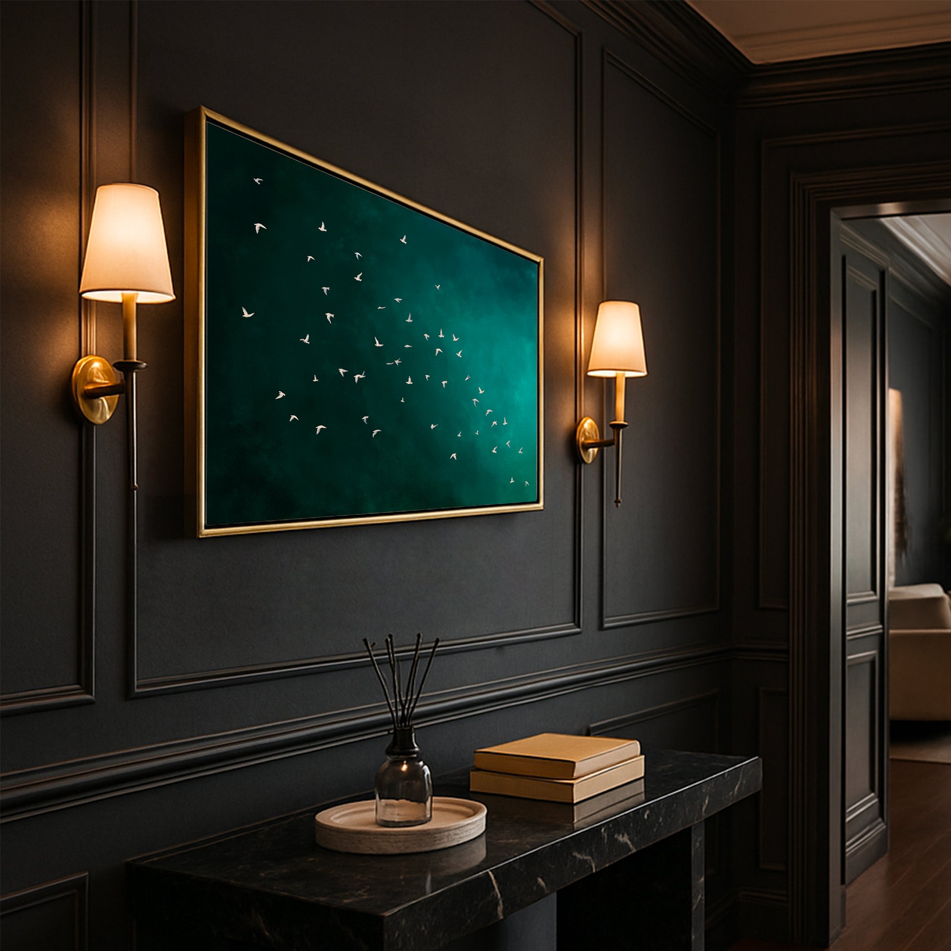 Let your space breathe with movement and calm through this elegant canvas wall art featuring a flock of birds in flight across a rich, dark teal sky. This minimalist design captures the quiet freedom of nature, offering a sense of depth, motion, and serenity all in one vertical frame.