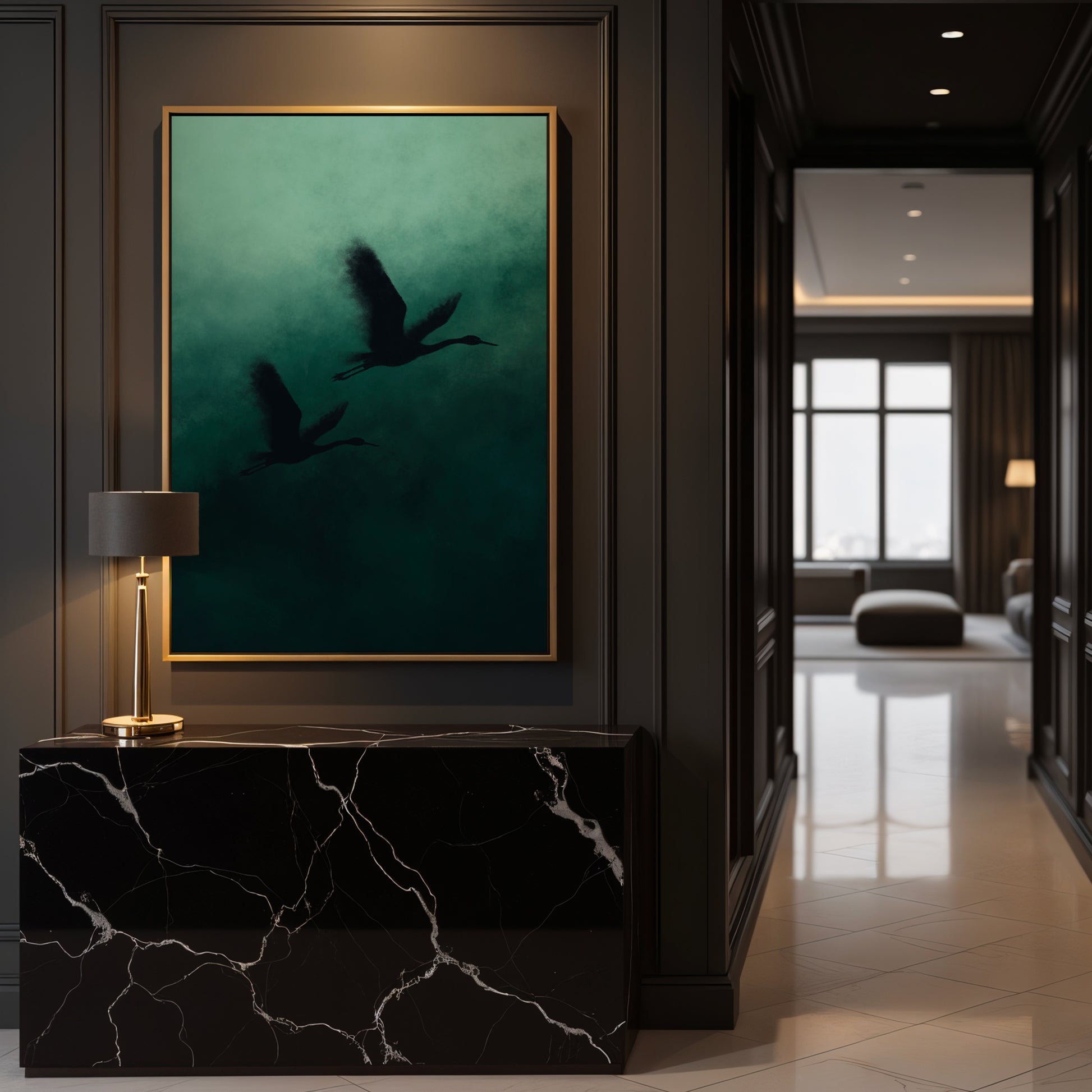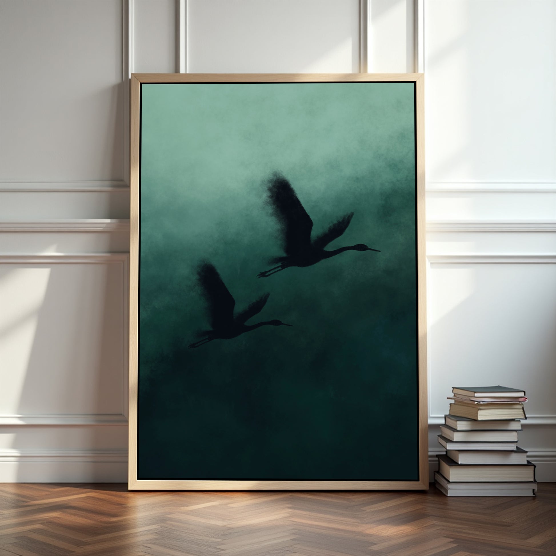 Capture the quiet beauty of nature with this striking wall art, featuring a silhouette of two elegant cranes in flight. The moody palette of deep forest green, smoky teal, and charcoal black creates a calming yet dramatic effect, perfect for adding depth and sophistication to your space. The contrast between the soft, fog-like textures and the bold bird silhouettes makes this piece both modern and timeless.