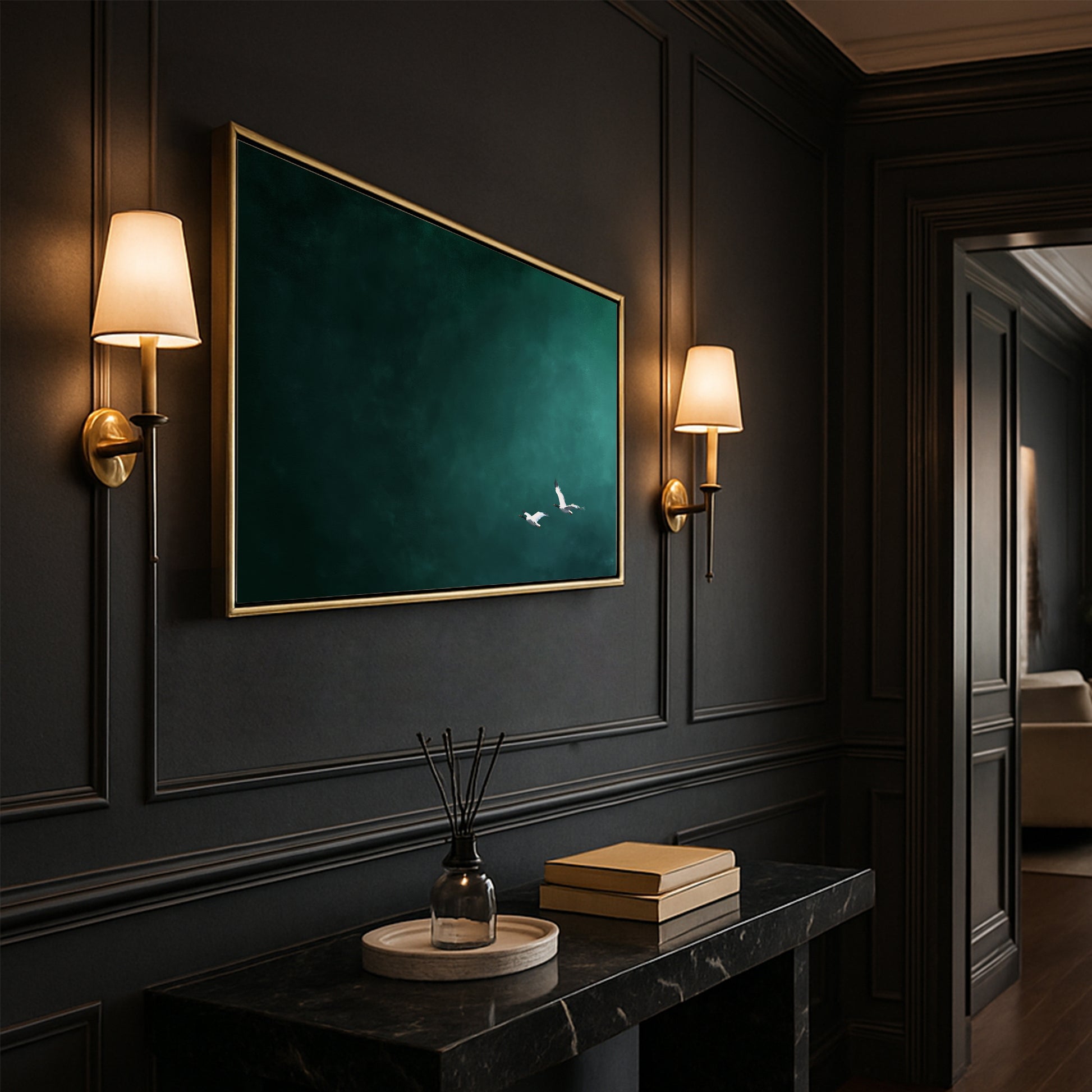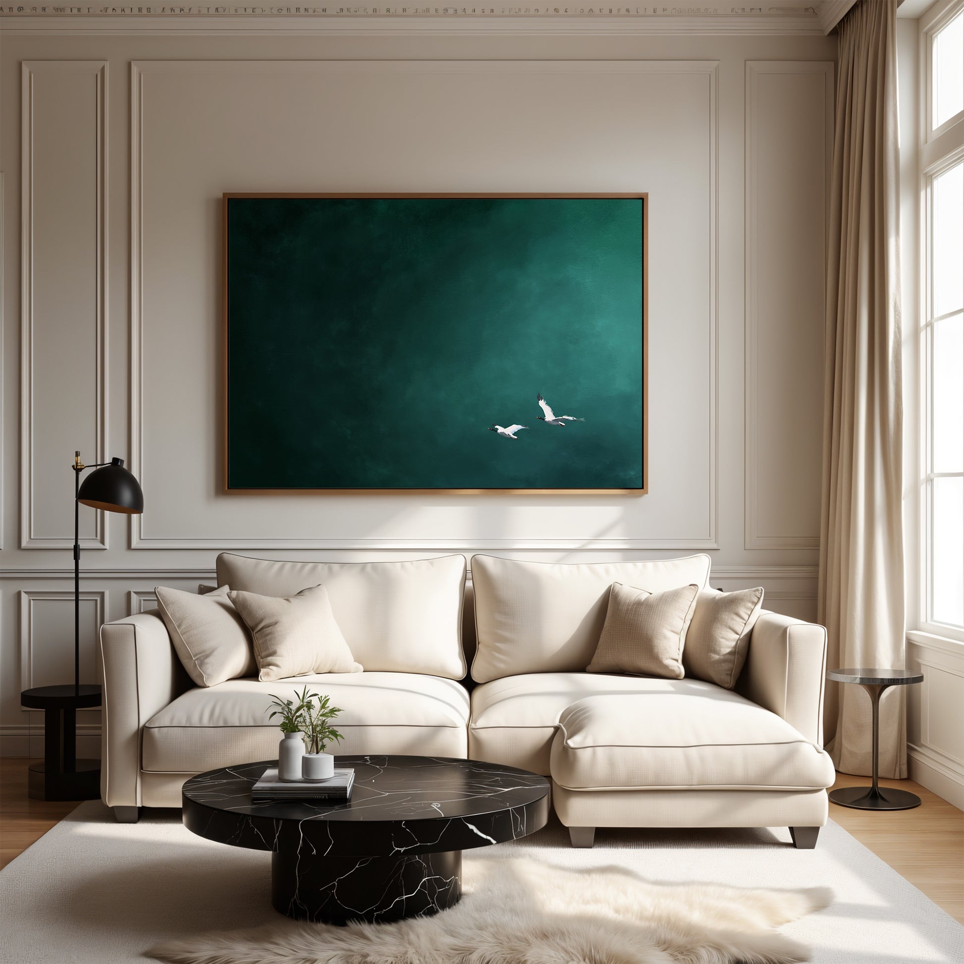 Bring a touch of serenity and elegance to your space with this beautifully designed canvas print. Featuring two graceful birds in flight set against a stunning deep green sky, this artwork captures a sense of freedom, calm, and natural beauty. The minimalist composition makes it versatile for a variety of interiors, from modern and contemporary spaces to rustic and nature-inspired homes.